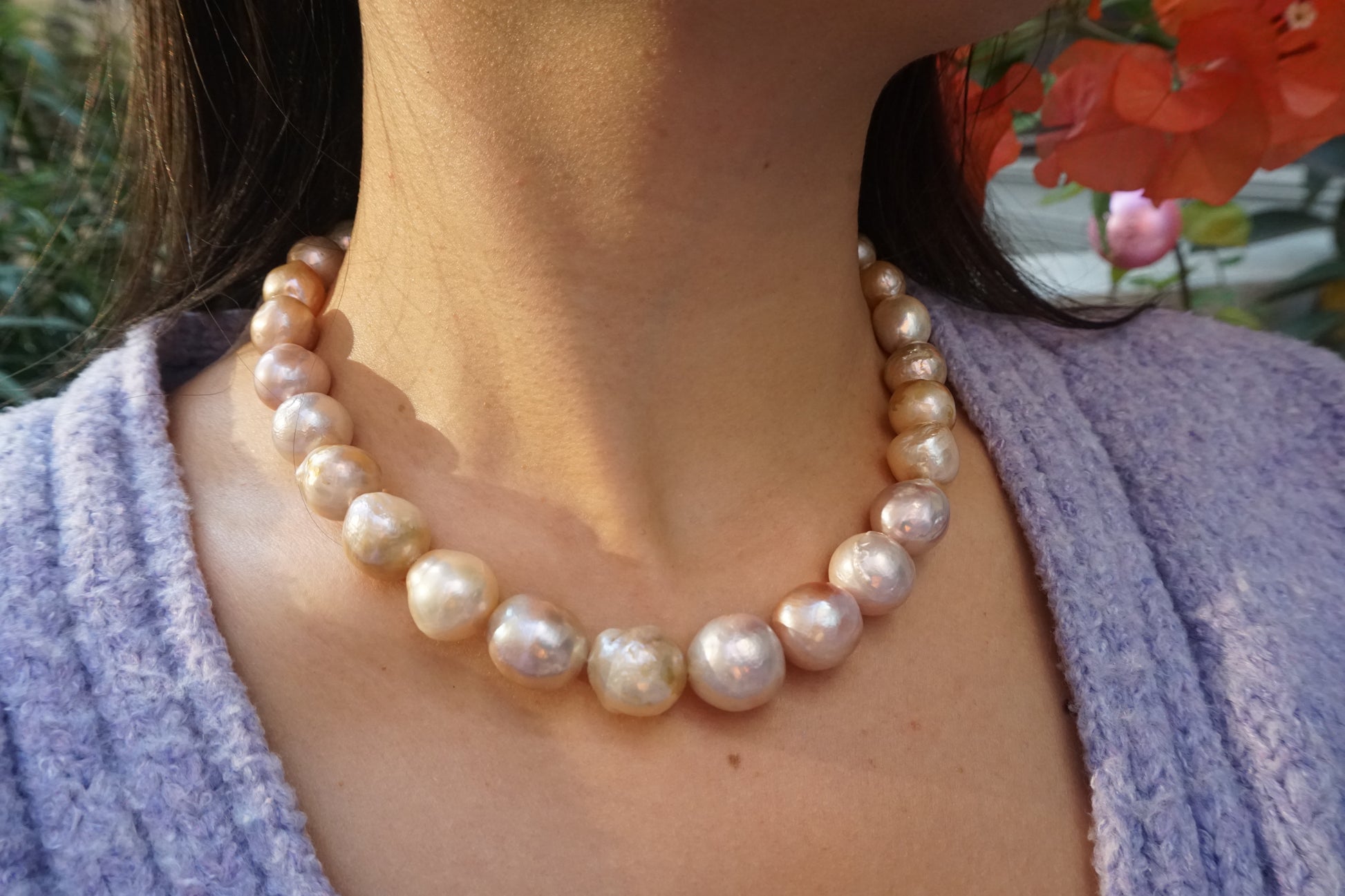 This Eartha 12-17mm Large Freshwater Baroque Pearl Necklace in pink is an eye-catching piece of jewelry. With large baroque pearls ranging from 12-17mm, this necklace is sure to make a statement. The pinkish hue adds a touch of elegance to this classic pearl strand.