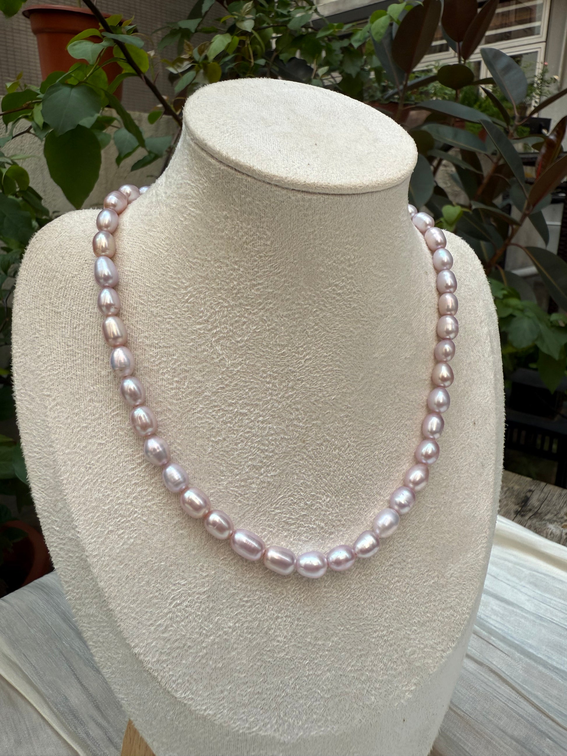 This 7-8mm Eloisa oval freshwater pearl necklace features a delicate light pink hue. Hand-selected and ethically sourced, this pearl necklace adds a touch of elegance to any outfit. Each pearl is perfectly shaped and offers a natural luster, making it a stunning addition to any jewelry collection.