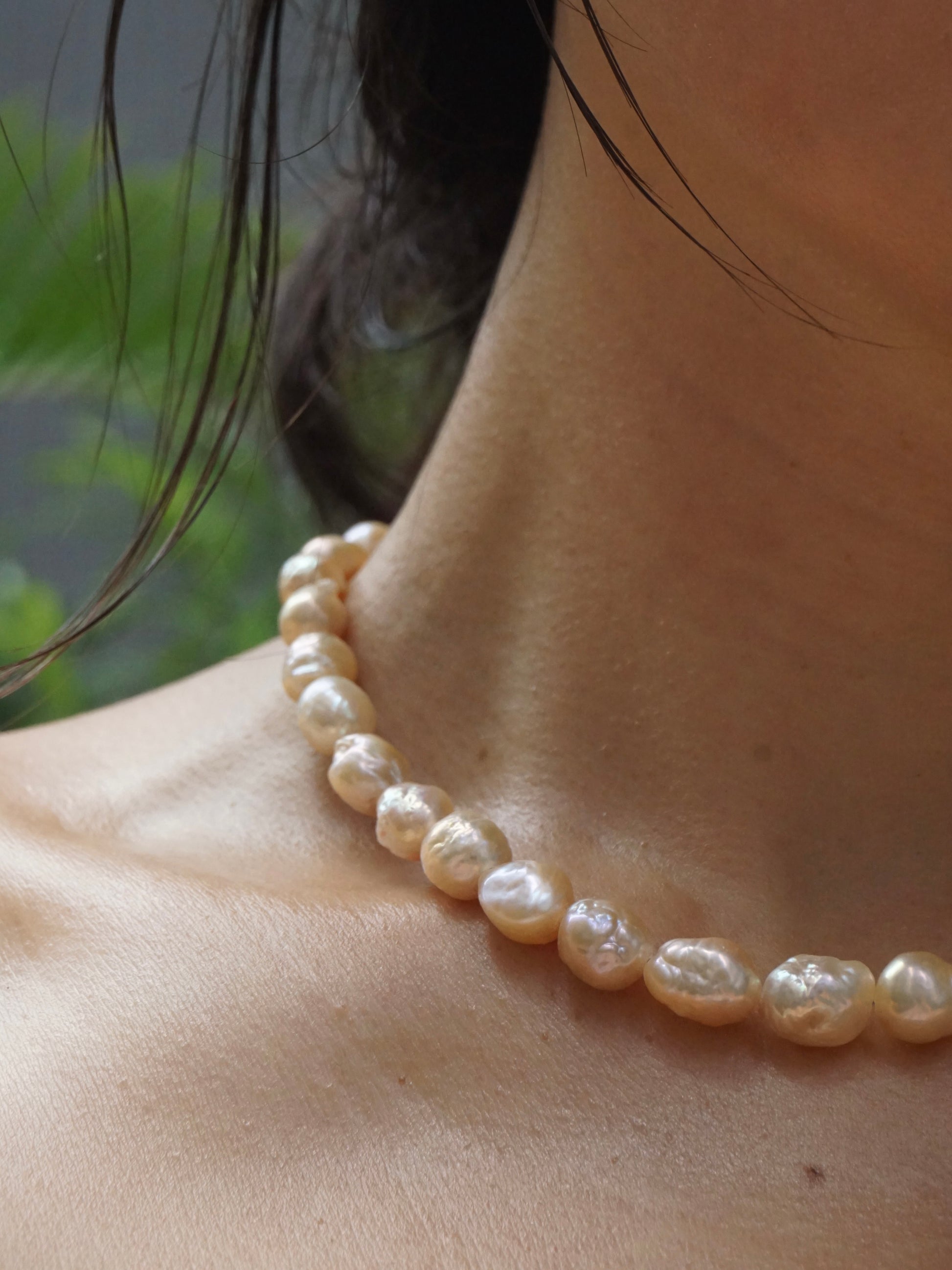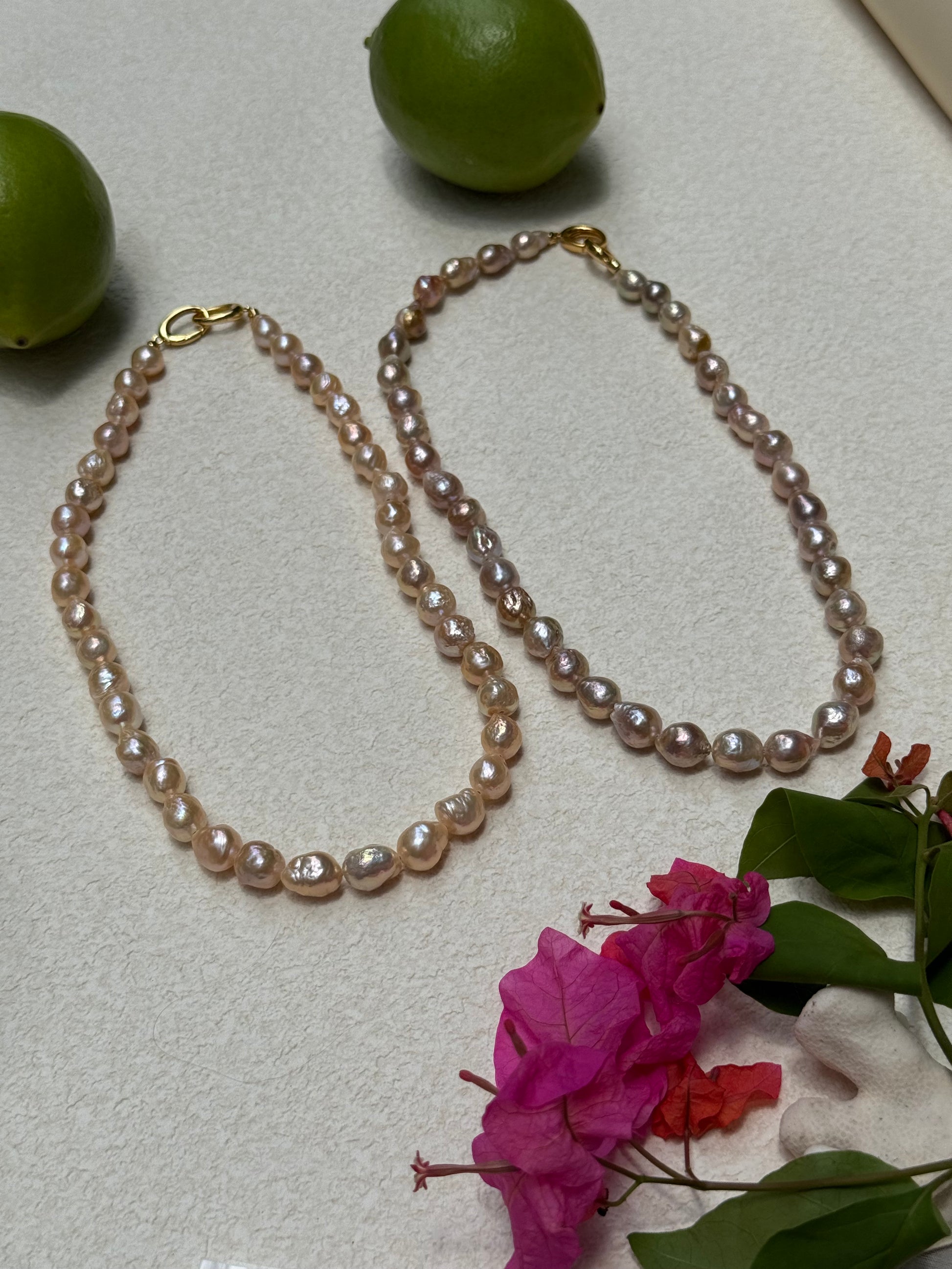 The Elriza necklace features 9-10mm freshwater baroque pearls known for their unique shapes and exceptional luster. Each high-quality pearl adds an organic elegance, making this piece a refined choice for those seeking a sophisticated yet distinctive accessory. Ideal for elevating both everyday and formal ensembles.