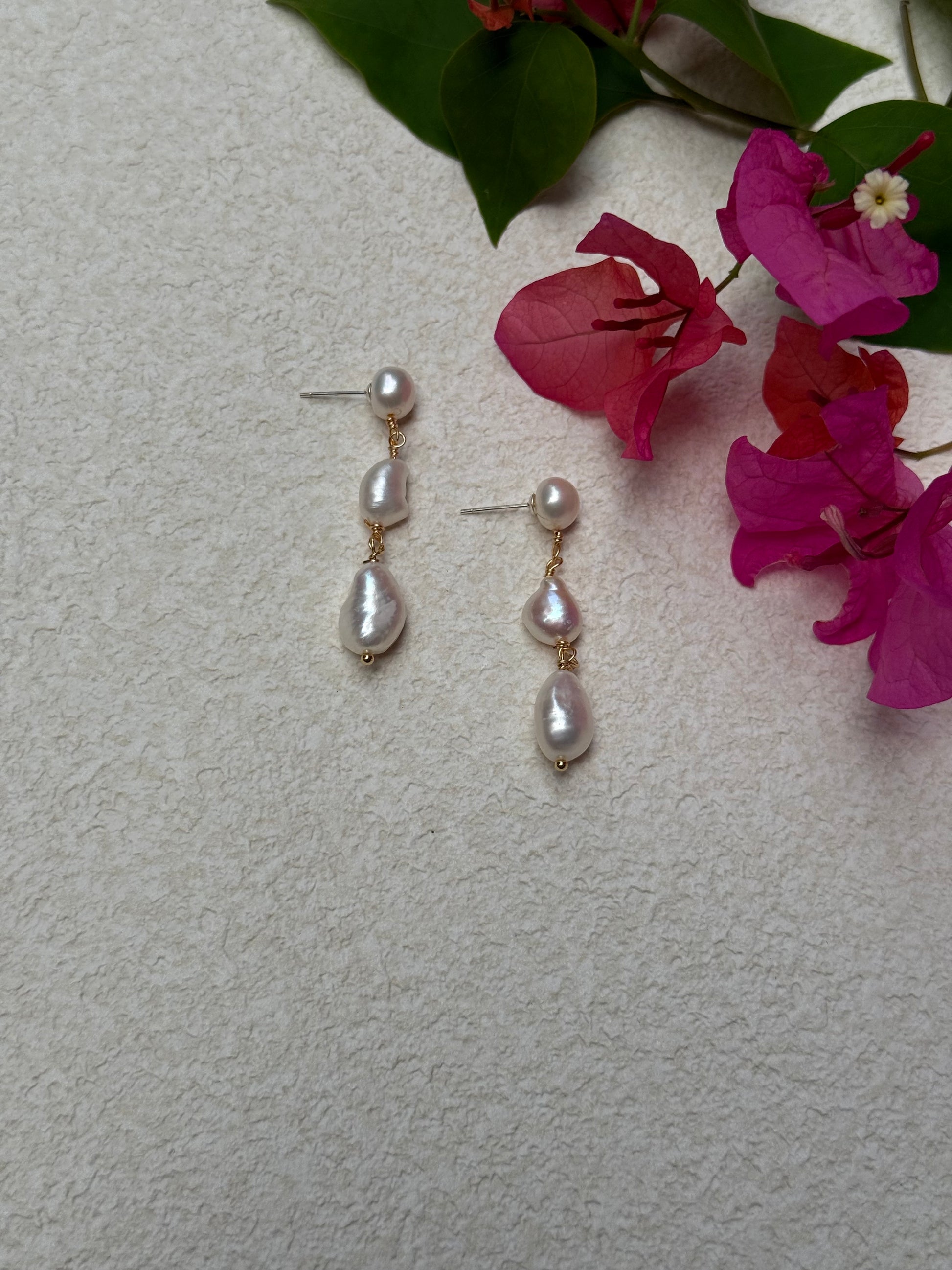 Expertly crafted with three freshwater pearls, these dangle earrings are perfect for any party or wedding. The 18K gold plating adds a touch of elegance to any outfit. Transform your look with these stunning earrings.