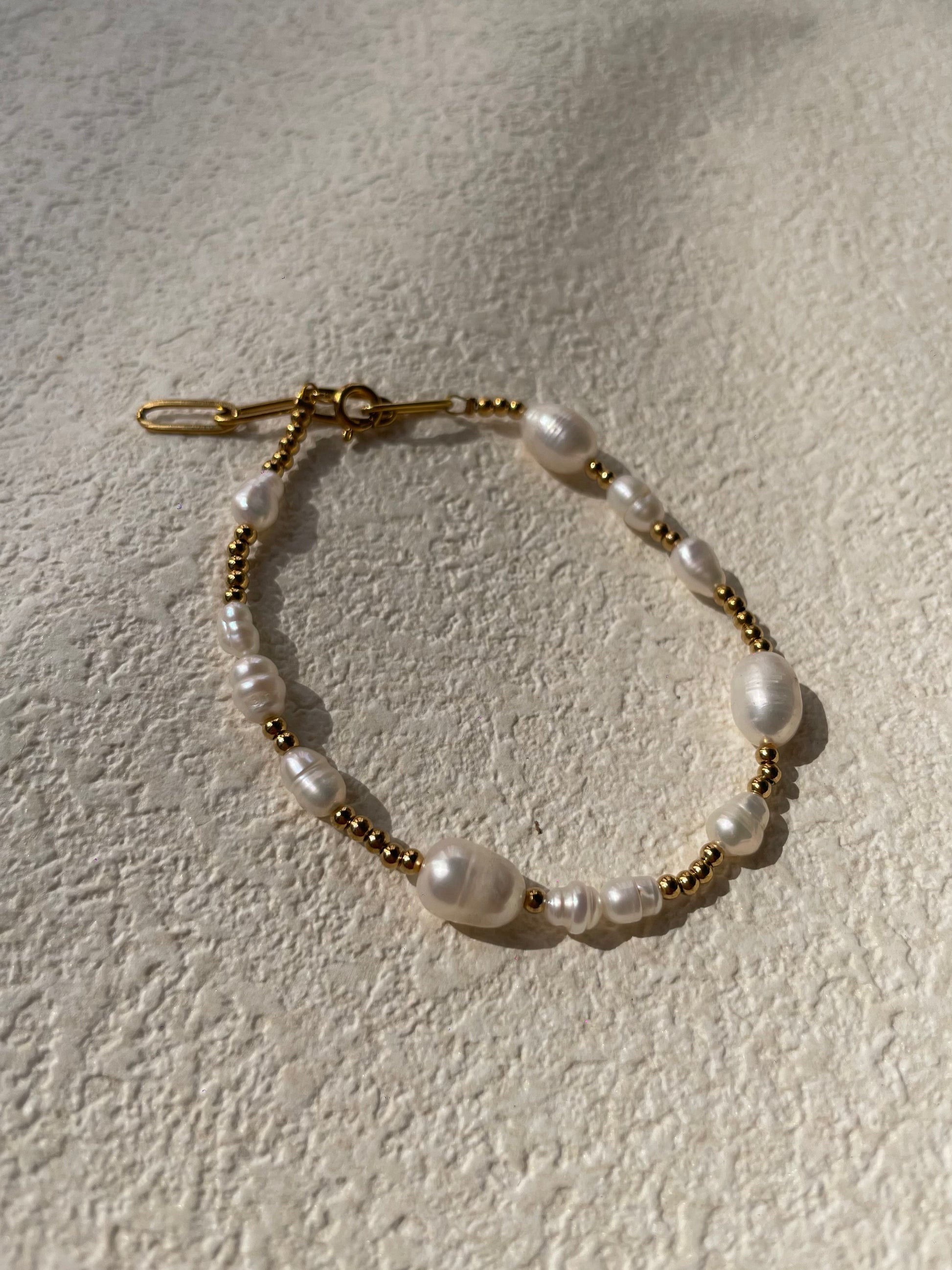 This Eyitope bracelet features different sizes freshwater pearls with golden minis beads, measuring 17mm in length with a 5cm extension. Elevate your style with the elegant combination of pearls and gold, perfect for any occasion.